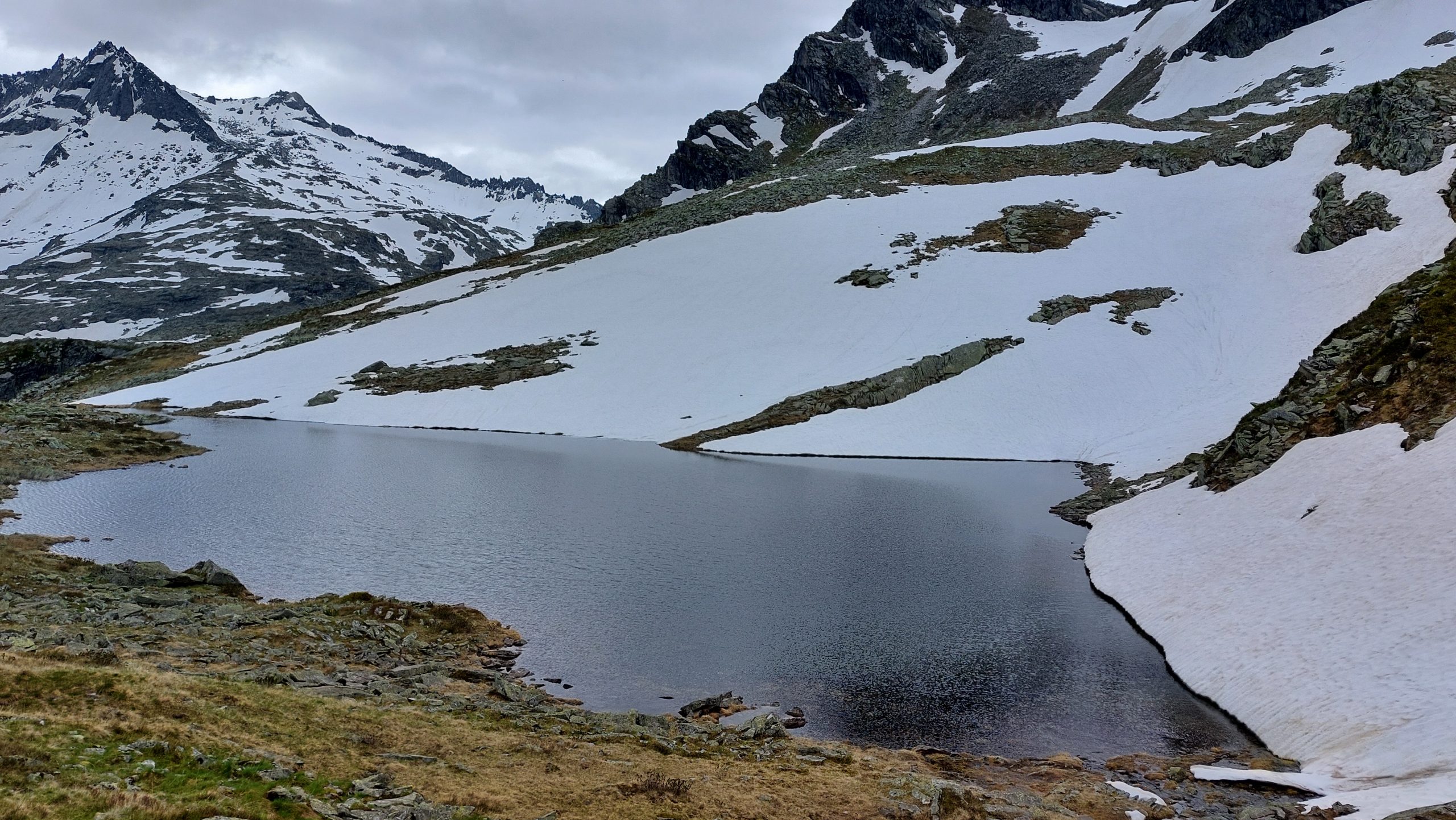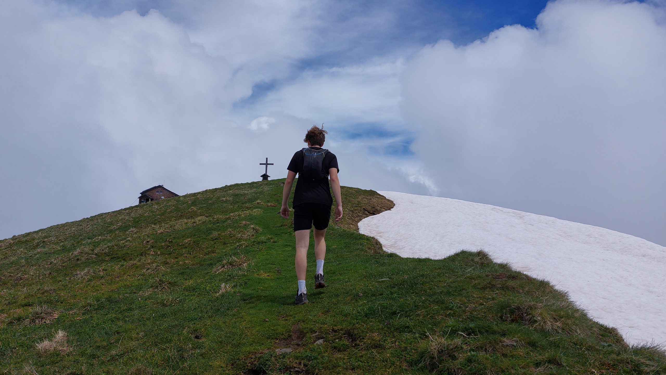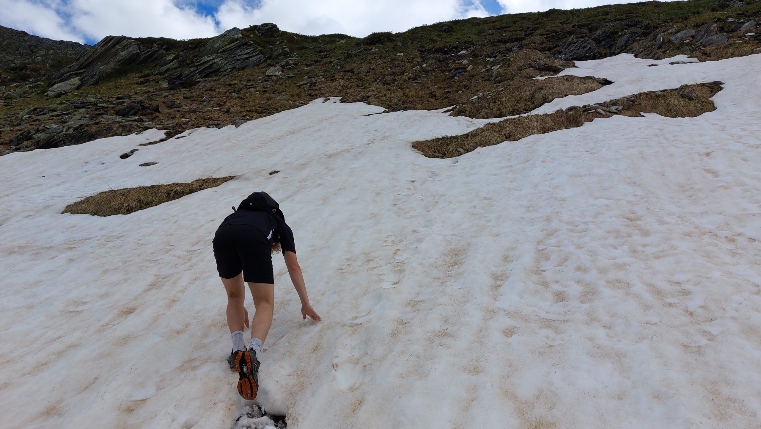 Op de klim naar boven toe moeten we steeds vaker van het pad afwijken omdat de sneeuwvelden over de paden heengeschoven waren. We hebben zelfs ge-gras-kletterd om de weg omhoog te vinden. De helling was zo steil dat we met handen en voeten naar boven moesten klauteren. Dat hoort natuurlijk niet bij bergwandelen of trailrunnen. Als we bovenaan op het pad van de bergkam zijn aangekomen, beseffen we beiden dat het niet verstandig is geweest wat we hebben gedaan. We houden elkaar even goed vast.