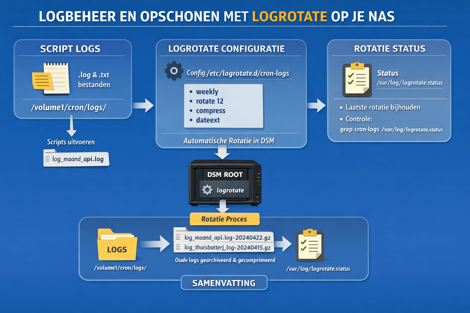 /volume1/cron/logs/ - Configuratie logrotate: