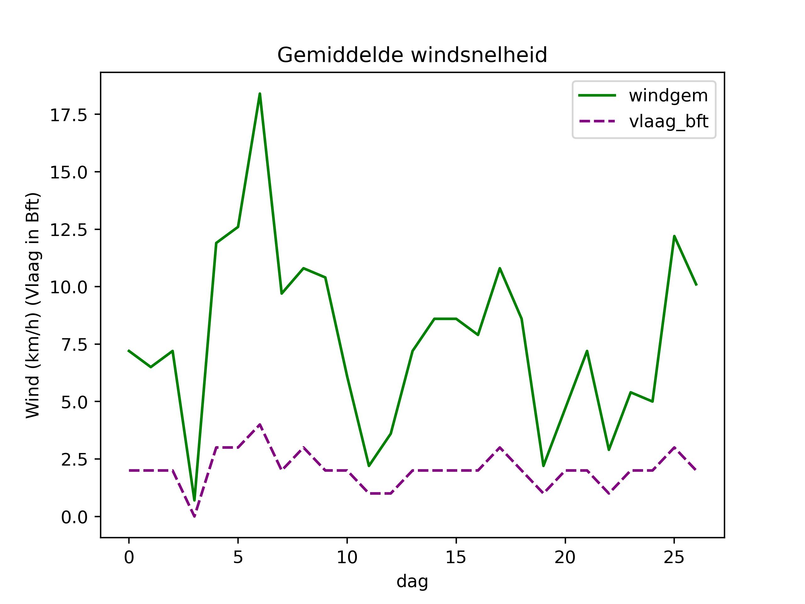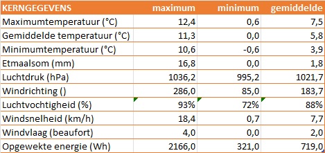 (temperatuur in °C, wind in km/u, windvlaag in Bft, regen in mm, luchtdruk in hPa, zonne-energie in kWh)