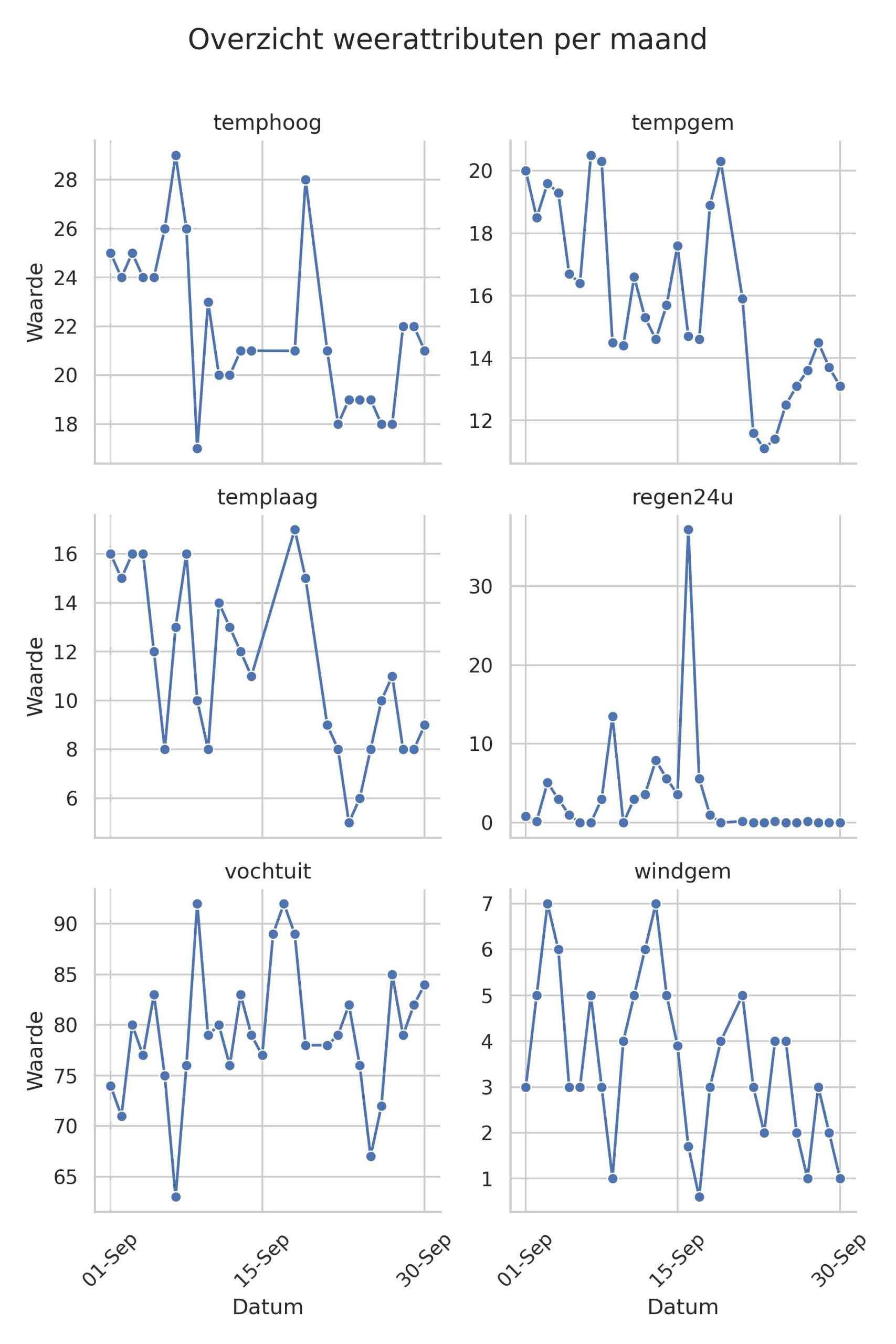 De gemiddelde temperatuur in september bedroeg 15.8 °C. De hoogste temperatuur die werd geregistreerd was 29 °C, terwijl de laagste temperatuur 5 °C bereikte. Dit weersverschil duidt op een duidelijke temperatuurdaling gedurende de maand.