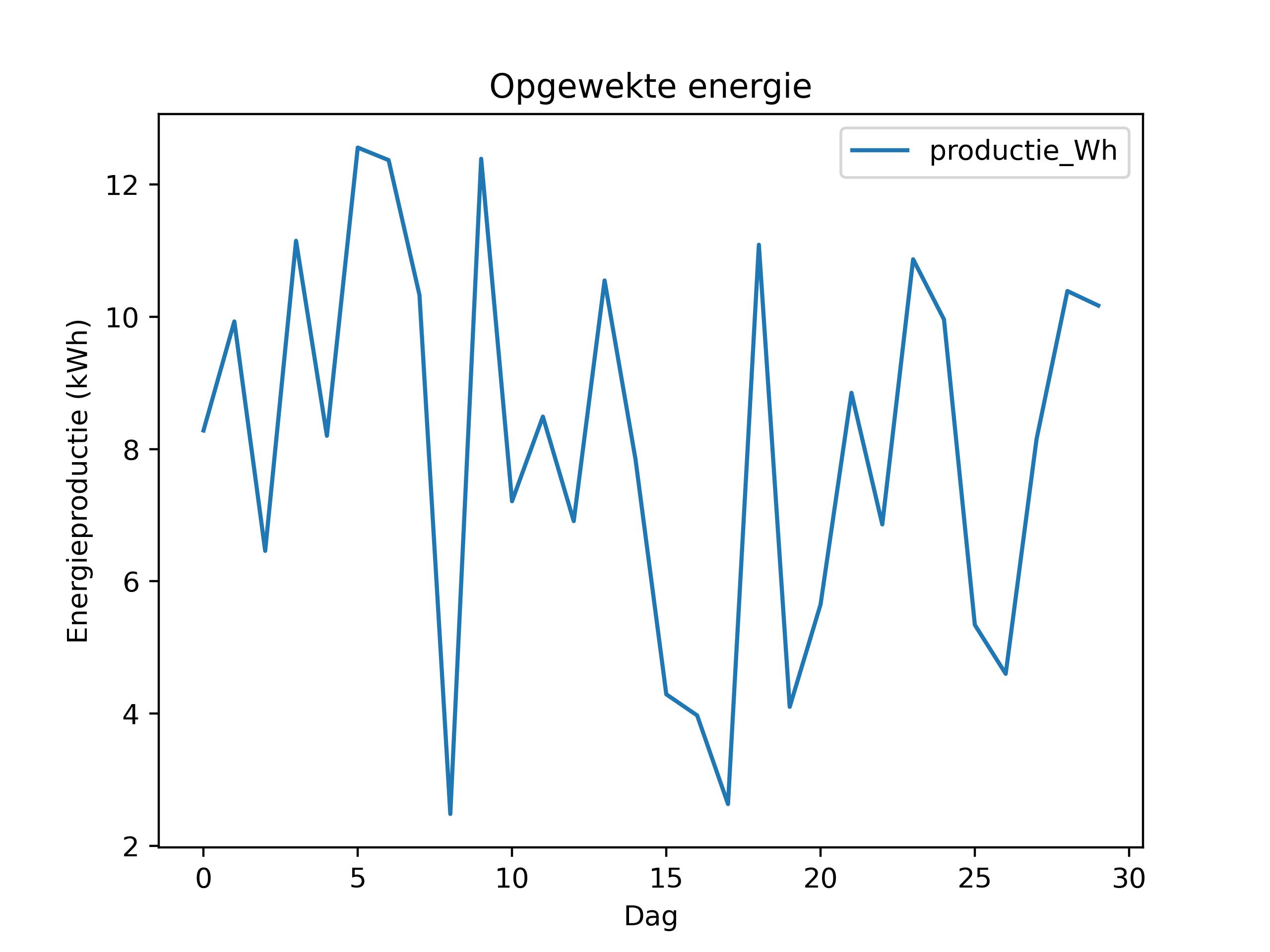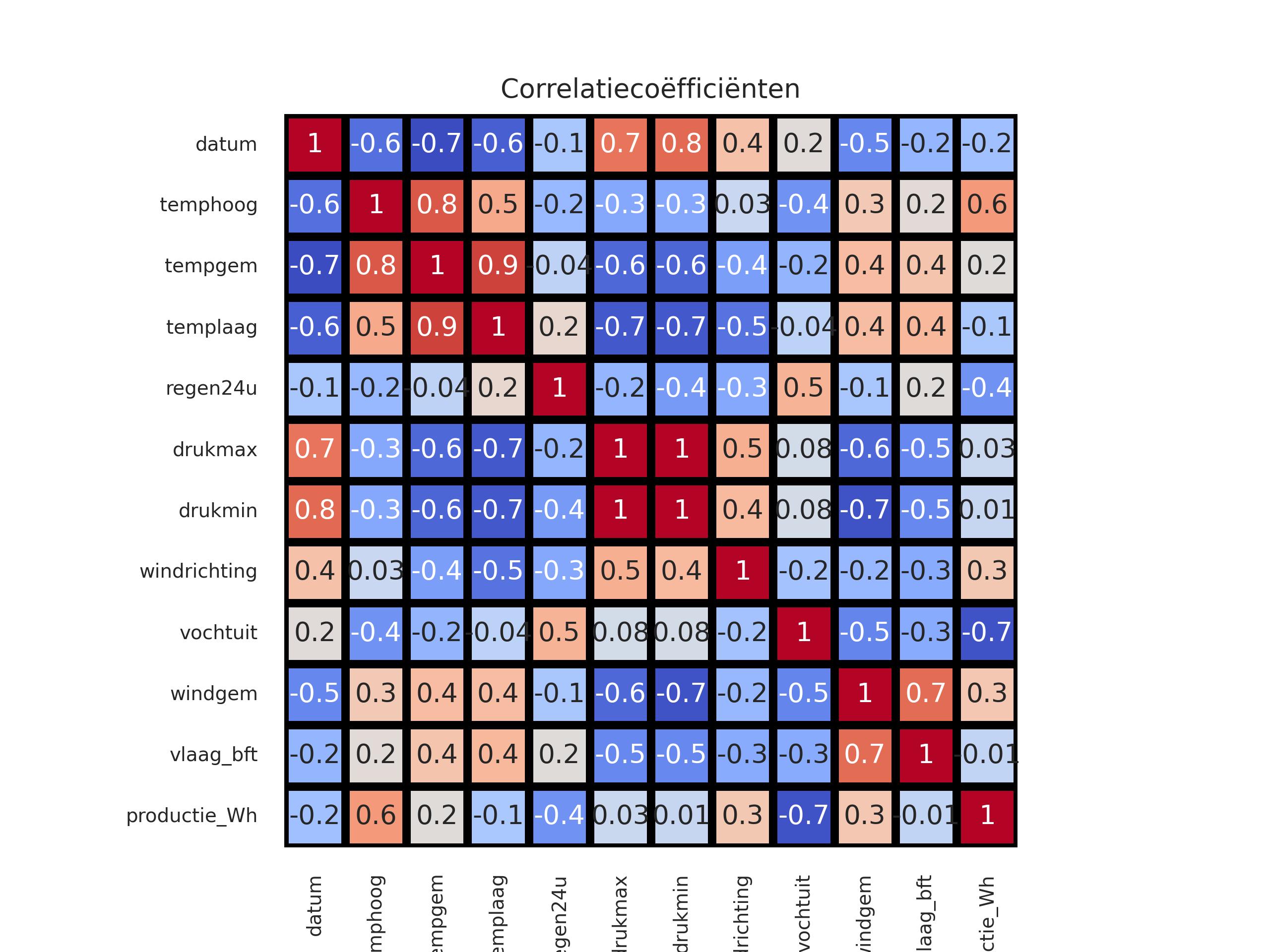 | temphoog | tempgem | templaag | regen24u | drukmax | drukmin | windrichting | vochtuit | windgem | vlaag_bft | productie_Wh | |