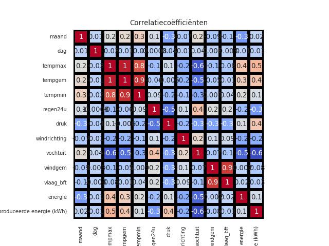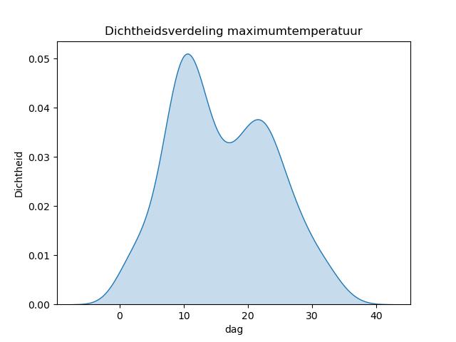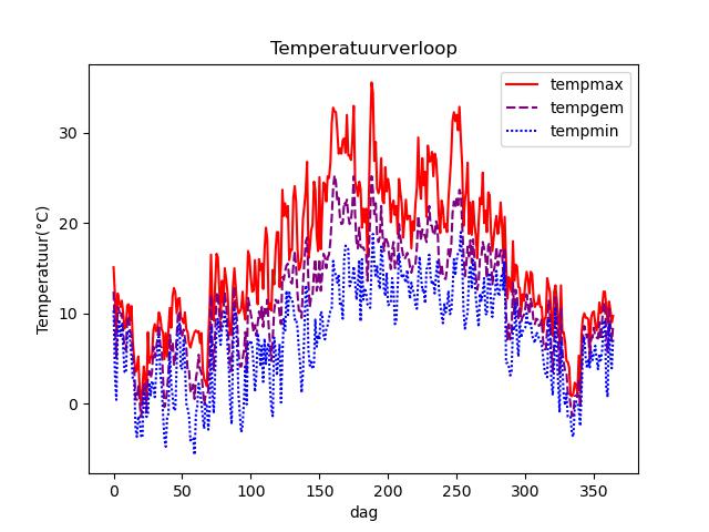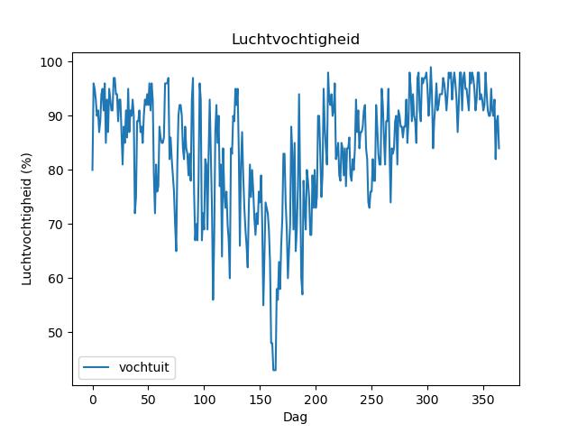 De temperatuurontwikkeling is voor gemiddelde temperatuur, de maximumtemperatuur en de minimumtemperatuur in figuur 1 afgebeeld. Figuur 2 toont welke temperaturen het meest genoteerd werden. Figuur 3 geeft de neerslag weer. Figuur 4 toont de windsnelheid. De grafiek in figuur 5 geeft aan uit welke windhoek de wind het meest waaide. De figuren 6 en 7 geven een indruk van de luchtvochtigheid en de luchtdruk. Figuur 8 laat zien welke weersaspecten het meest of het minst samenhang met elkaar vertonen.